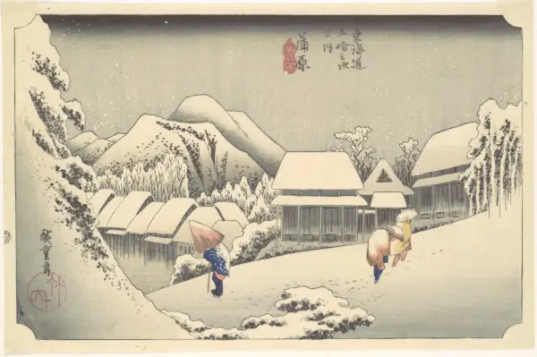 Utagawa Hiroshige (japani, Tokio (Edo) 1797–1858 Tokio (Edo), Ilta lumisadetta Kanbarassa, sarjasta Fifty-thres Stations of the Tōkaidō.Metropolitan Museum of Artin luvalla, Howard Mansfield Collection, Purchase, Rogers Fund, 1936