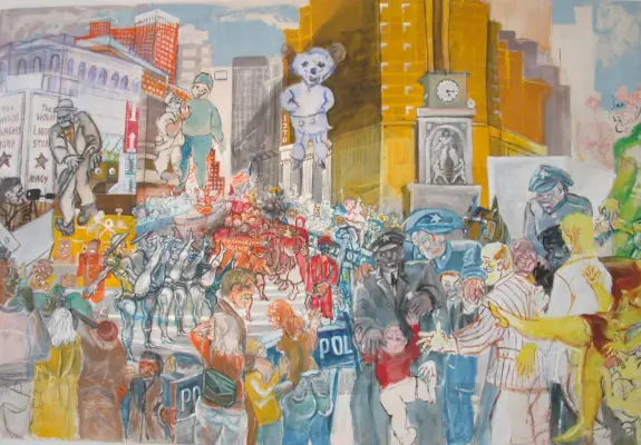 Tuhannet ihmiset kerääntyvät Manhattanin kaduille katsomaan vuotuista Macy's Thanksgiving Day Paradea, ja vielä enemmän on viritetty katsomaan tapahtuman tunnusomaisia ylimitoitettuja ilmapalloeläimiä Fifth Avenuella televisiossa. 1900-luvun alussa Knoxvillessä Tennesseessä syntynyt Delaney tuotti kohtauksia katuelämästä ja juhlista koko elämänsä ajan – erityisesti paraatteja – varsinkin sen jälkeen, kun hän muutti New Yorkiin vuonna 1930, missä hän tuli opiskelemaan Thomas Hart Bentonin johdolla. Kuten monet muutkin mustat taiteilijat tuolloin, hänet suljettiin usein pois gallerioiden ja instituutioiden näyttelyistä, mutta hän lähti kaduille, jotka inspiroivat hänen maalauksensa näyttämään teoksiaan, jotka olivat esillä Washington Squarella lähes 50 vuoden ajan. Delaney on kirkkaanvärinen Macyn paraati vangitsee Manhattanin jännityksen ja yltäkylläisyyden, jota hän ihaili, erityisesti kalkkunan päivänä.