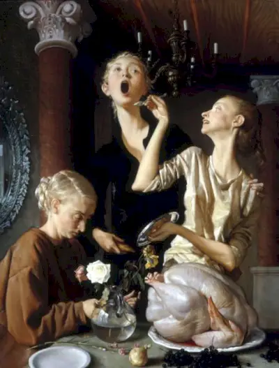 Currinin kohtauksessa kolmesta naisesta, jotka kerääntyvät keittiön pöydän ympärille valmistamassa kiitospäivän juhlaa, on useita hieman epärealistisia piirteitä: koehenkilöiden liian pitkät kaula (ei ehkä toisin kuin kalkkunalla), ruusumaljakko, jotka varmasti pääsevät sisään. tapa itse asiassa tehdä kaikki valmistelutyöt ja taustalla olevat marmorikorinttiset pylväät, joita ei luultavasti löytyisi tavallisesta amerikkalaisesta kodista. Mutta kypsentämättömän linnun erehtymättömän vaalea kiilto ja sairaan vaaleanpunaiset mehut, jotka kerääntyvät lautaselle sen alle? Taiteilija sai ne vain oikein.