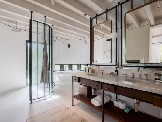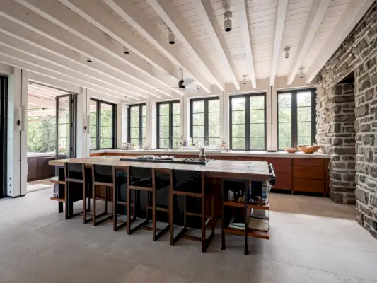 Shoenfelder suunnitteli uuden talon, joka on saanut inspiraationsa kiinteistön navetoista, jossa on kaksinkertaiset katot ja yksityiskohdat vuoropuhelussa kartanon perintörakenteiden kanssa. Kiviseinät ja aksentit kutsuvat joen varrella olevia kiviä, siilomaisessa nurkassa on amme, ja hytistä talteen otettu puu koristaa muta- ja jauhehuoneen seiniä. Ennen rakentamisen aloittamista, kun suunnitelmia konkretisoitiin, Kerzner ja hänen tyttärensä asuivat tässä mökissä lehden mukaan.