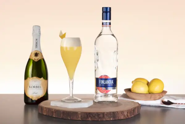 Rakenna huilulasiin ja sekoita. Koristele sitruunankuorella.