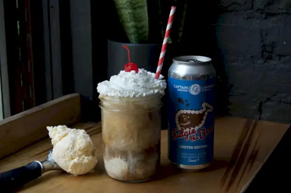 Lisää kaksi mittalusikallista vaniljajäätelöä lasiin. Päälle Captain Lawrence Brewing Co. Fudgie the Beer -tölkki. Koristele kermavaahdolla ja kirsikalla.