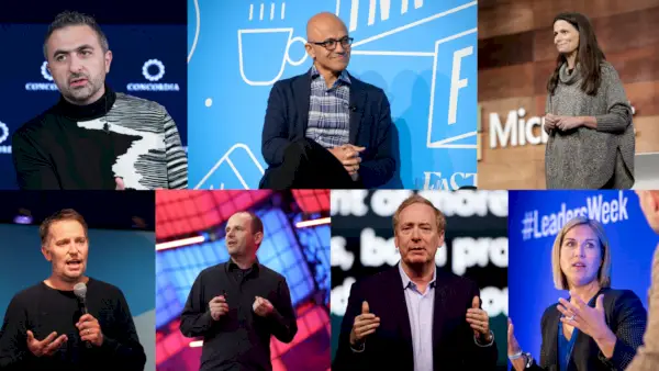(Ylhäältä vasemmalta oikealle) Mustafa Suleyman, Satya Nadella, Amy Hood, Ryan Roslansky, Thomas Dohmke, Brad Smith ja Kathleen Hogan.Getty Images