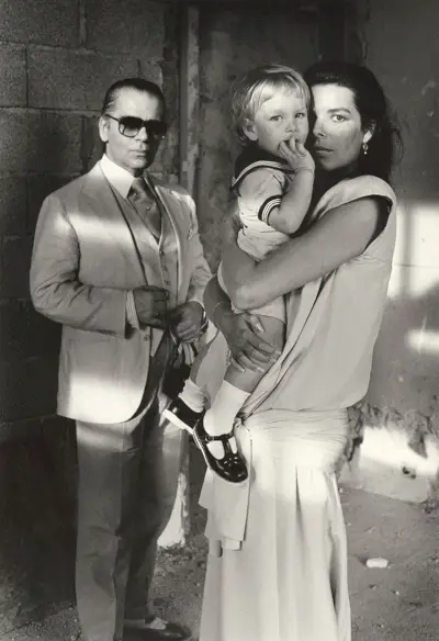 Monacon prinsessa Caroline poikansa Andrea ja Karl Lagerfeldin kanssa, La Vigie, Monaco 1986.Helmut Newtonin säätiö