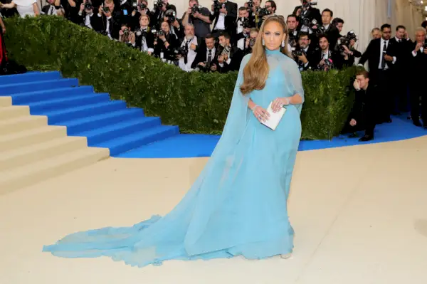 Lopezin räätälöidyn Valentino-mekon lentävä viitta sopi dramaattiselle kävelylle Metropolitan Museum of Artin portaille vuonna 2017. Läpinäkyvä sininen puku oli yksilöllinen malli, joka debytoi Valentinon kevään 2017 muotikiitoradalla, ja J.Lo lisäsi lisää yli 150 karaatin Harry Winston -timantteja vintage-korvakoruilla ja rannekoruilla.