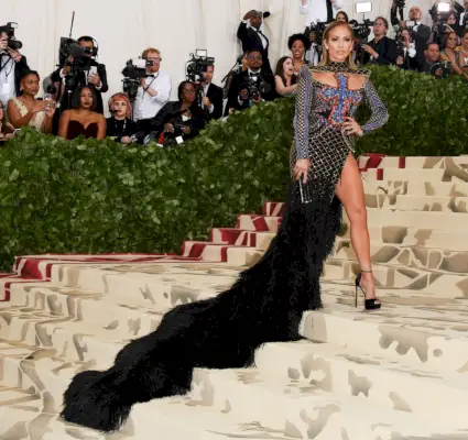 Grammy- ja Golden Globe -ehdokkuuden alla Lopezista oli tullut tuttu nimi, kun hän osallistui toiseen Met-gaalaan vuonna 2004. Domenico Dolcen ja Stefano Gabbanan käsivarsille saapuessaan Lopez käytti suunnittelijoiden mustaa, porrastettua pitsipukua. , joka sisälsi korsetin selkäosan ja ruusukkeen yksityiskohdat.