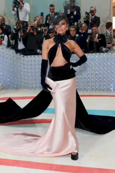 Lopez kääntyi jälleen Ralph Laurenin puoleen saadakseen veistoksellisen mekon, jossa oli musta samettiriimupääntie ja vaaleanpunainen silkkisatiinihame. Halusimme vangita vaikutuksen, joka Karl Lagerfeldillä on ollut kaikkiin muodin parissa, mutta hyvin Ralph-, hyvin J.Lo-tavalla, laulaja ja näyttelijä sanoivat yhteistyöstä, joka osoitti kunnioitusta edesmenneelle Chanelin luovalle johtajalle. Pukuun kuului iso musta samettinen rusetti, joka kulki Lopezin takana, kun hän kulki ylös Metropolitan Museum of Artin portaita pitkin, mutta se ei ollut kaukana ainoasta näyttävästä yksityiskohdasta, joka yhdistettiin silkkisatiini-iltakäsineiden kanssa. , Philip Treacyn verhottu lumoava ja Lorraine Schwartzin korut.