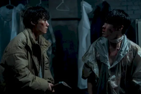 Chang Ryul (vas.) Geuk-ryulina ja Jin Sun-kyu Noh Hyung-soona elokuvassa Tinkiä .TVING Co/Paramount+