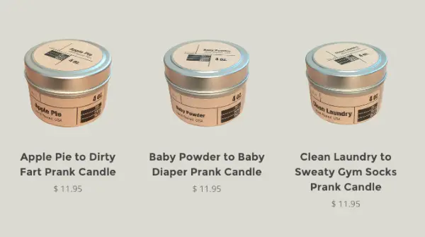 Tarjoamat tuotteet WTF kynttilät palaa perinteisempään pilailun aikakauteen. Kynttilät – jotka voidaan lähettää nimettöminä valitsemillesi vastaanottajille – alkavat tuoksua hyvältä, mutta muuttuvat vähitellen iljettäviksi hajujen levittäjiksi. Alla kuvatut tuoksumuunnokset ovat todella inspiroituja: