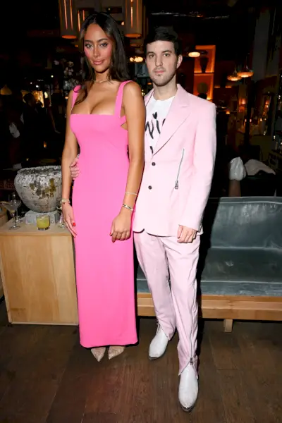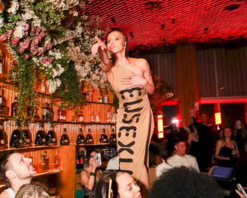 Emily Ratajkowski , Carlos Nazario , Paloma Elsesser , Raul Lopez , Renell Medrano ja Francesco Risso isännöivät, ja koko ilmapiiri oli rehellisesti A+verhot kaikkialla, hehkuvat valot ja Zack Bia DJ-kopissa. Olin innoissani musiikista; Jos deep house olisi pelannut, olisin luultavasti lähtenyt heti. Olin myös iloisesti yllättynyt kuullessani, että Clase Azul hoiti baaria, ja siemailin iloisena juomaa, kun vieraat alkoivat suodattaa sisään. Huono Bunny , Charli XCX , Daniel Lee , Kendall Jenner , Marc Jacobs , Law Roach , Odell Beckham Jr. ja Olivier Rousteing . Lana Del Rey , joka oli edelleen hyvin teemana kukkakeijuprinsessamaisessa kokoonpanossa, poseerasi samppanjatornin edessä.
