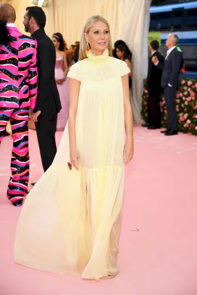 The Camp: Notes on Fashion -teema vuoden 2019 Met-gaalassa saattoi tuoda esiin joitain ylivoimaisimpia ilmeitä etutapahtuman historiassa, mutta Paltrow valitsi jotain hillitympää Chloén ilmavassa sifonkipukussa. Mittatilaustyönä oli vaalea keltainen sävy pehmeällä röyhelöyksityiskohdalla ja korkealla pääntiellä.
