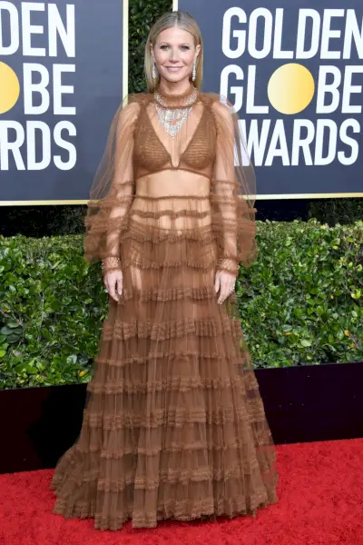 Perinteisen pukureitin sijaan Paltrow poseerasi Golden Globesin punaisella matolla matalat ruskeat housut ja keltainen kaula-aukkoinen riimutoppi, joka oli koristeltu strassit. Hänen riimupääntieensä poikki asettuneiden kaulakorumaisten kristallien lisäksi Paltrow varusteli kultaisilla tikarikorvakoruilla ja sarjoilla yhteensopivia kultaisia rannekkeita.