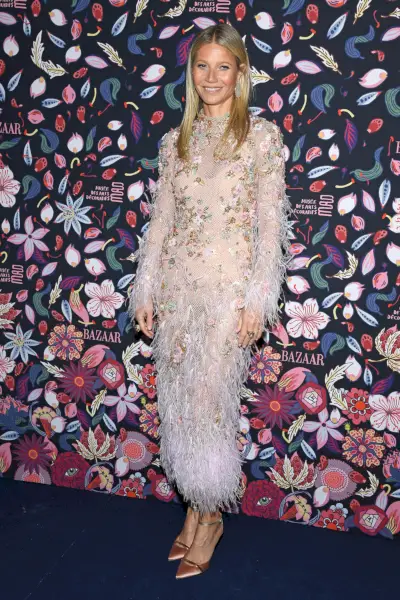 Paltrow valitsi hienostuneen ulkoasun seuraavan kuukauden aikana, kun hän suuntasi Pariisiin juhlimaan sitä Harper's Bazaar: Ensimmäinen muodissa näyttely Musée des Arts Décoratifsissa. Hänen pastellimekkonsa tuli Ralph & Russon kevään 2020 couture-kokoelmasta, ja se sisälsi kaikkea ohuista strutsin höyhenistä tekojalokivikoristeisiin ja hohtaviin paljetteihin ja helmikukkiin.