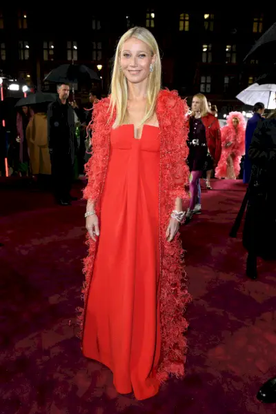 Paltrow valitsi jälleen vintage Valentinon, tällä kertaa juhliessaan legendaarista suunnittelijaa British Fashion Awardsissa. Valentinon pitkäaikainen liikekumppani ja ystävä Giancarlo Giammetti otti Valentinon puolesta vastaan Outstanding Achievement Award -palkinnon, jonka Paltrow luovutti klassisessa olkaimettomassa punaisessa mekossa, jonka suunnittelija loi vuonna 1965. Paltrow lisäsi punaiselle matolle yhteensopivan kristalli- ja höyhenkoristeisen punaisen takin. , ja Van Cleef & Arpelsin vintage-timantti- ja rubiinikorut täydensivät ilmeen.