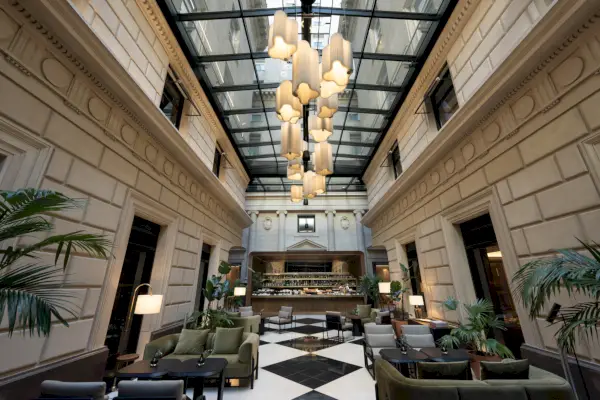 Mutta vaikka 1800-luvun kulta-aika on uudelleensuunnittelun perusta, sisustuselementit nojaavat voimakkaasti myös Art Decoon, ja niissä on yksivärinen mustan ja neutraalin sävyinen väripaletti. Keskusatrium – jonne vieraat tulevat sisään ennen kuin he vierailevat joko ravintolassa, baarissa tai varaustiskillä – nojaa luonnonvaloon, joka pomppaa pois kalkkikiven sävyisistä seinistä. Ja kaikkialla yleisissä tiloissa ja huoneissa tunnelma tuntuu sekä modernilta että ammattimaiselta, ja siinä on pellavaa, nahkaa ja puuta.