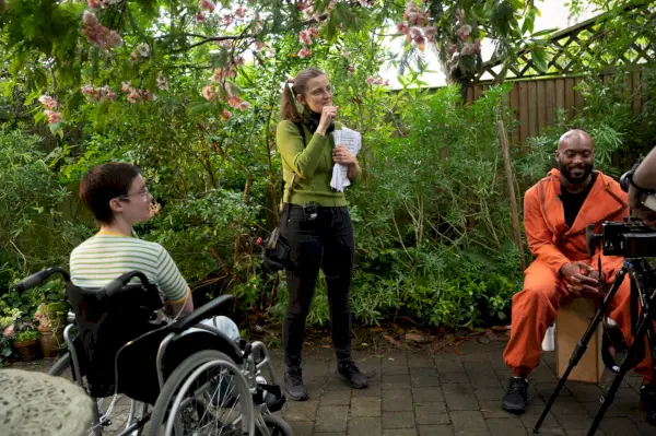 Lola Petticrew, ohjaaja Daina O. Pusić’ ja Arinzé Kene kuvauksissa tiistai .A24:n luvalla