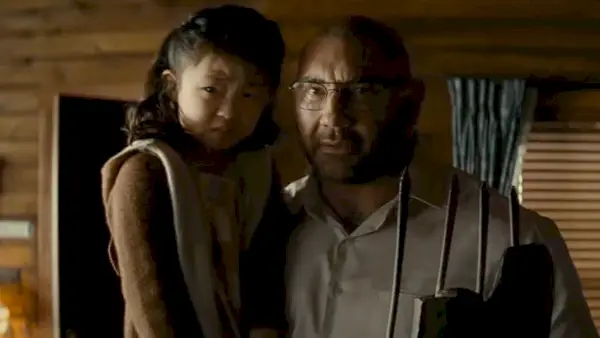 Kristen Cui (vas.) ja Dave Bautista elokuvassa Knock at the Cabin.Universaalit kuvat