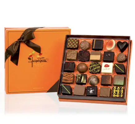 Kenen puoleen voisi kääntyä ystävänpäivän suklaalahjoituksessa kuin itse herra Chocolaten, Jacques Torresin puoleen? Tämä suklaavalikoima sisältää joukon suklaavalmistajan myydyimpiä bonboneja, joissa on klassisia makuja, kuten hasselpähkinä ja karamelli, sekä luovia keksintöjä, kuten Love Bug (key lime ganache ja valkoinen suklaa) ja Love Potion #9.