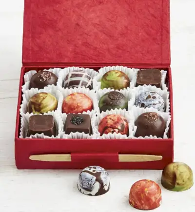 Kukapa ei tekisi vaikutuksen avaamalla nämä käsintehdyt, käsinmaalatut suklaat? Jos etsit kekseliäisempiä makuja, et tule pettymään, sillä esimerkiksi mansikka- ja sitruunatimjami-valkosuklaa ganache, Madagaskar-marinoitu vihreä pippuri valkosuklaa ganache ja rosmariinilla maustettu karamellimaitosuklaa sienisuolalla.
