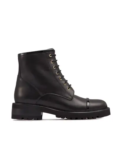 Näissä ajattomissa, laadukkaissa nahkaisissa taistelusaappaissa on hillityt kultaiset aksentit ja kiiltonahkahihna varpaassa ja nilkassa. Sivuvetoketju mahdollistaa helpon irrotuksen, joten sinun ei tarvitse irrottaa kaikkia nauhoja joka kerta.