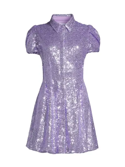 Jos haluat juhlamekon, sinun on kokeiltava tätä hohtavaa paljetteista paitamekkoa, jossa on levenevä hame, puhvihihat ja prim-nappikaulus.