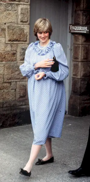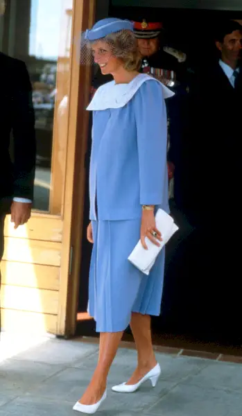 Prinsessa Diana lisäsi pukuja äitiystyyliinsä ja käytti tätä Jan Van Veldenin sinistä settiä tavatakseen potilaita ja henkilökuntaa Odstockin sairaalassa Salisburyssa Englannissa ollessaan raskaana prinssi Harryn kanssa. Hänen ilmeensä sisältyi hattupäällikkö John Boydin sininen hattu verkkohuunolla, ja Diana yhdisti asusteet puvun valkoiseen nelikulmaiseen kaulukseen, jossa oli valkoiset pumput ja kytkinlaukku.