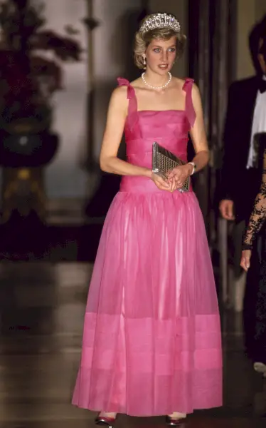 Prinsessa Diana koki monia mieleenpainuvia muotihetkiä 17 päivän Italian-kiertuellaan prinssi Charlesin kanssa vuonna 1985 (mukaan lukien mustalla verholla peitetty yhtye hänen kuulijansa aikana paavi Johannes Paavali II:n kanssa), mutta tämä vaaleanpunainen Victor Edelsteinin puku sopi parhaiten kuninkaalliseen. Hihaton malli, jossa on istuva liivi ja lentävä hame, oli juuri sopiva illalle La Scala -oopperatalossa, ja Diana oli koristeltu helmikaulakorulla, helmikorvakoruilla ja Lover's Knot -tiaaralla; kokoelma timantteja ja riippuvia helmiä, joka tehtiin alun perin Queen Marylle vuonna 1913. Tämä tiara osoittautui lopulta Kate Middletonin suosikiksi.
