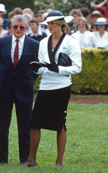 Vuoden 1985 Australian-kiertuellaan prinsessa Diana osallistui myös Melbourne Cupin hevoskilpailuun, jossa hän pukeutui Bruce Oldfieldin valkoiseen ja mustaan pukuun. Milliner Frederick Fox loi yhteensopivan hatun, ja Diana lisäsi mustat hanskat, kytkinlaukun, pumput ja saumaiset sukkahousut, joissa oli pienet rusetit nilkassa.