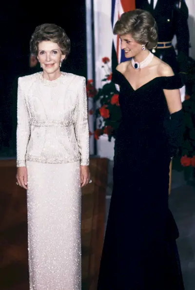 Virallisen vierailun aikana Yhdysvaltoihin prinsessa Diana osallistui illalliselle Valkoisessa talossa, jossa hän tapasi presidentti Ronald Reaganin ja ensimmäisen naisen Nancy Reaganin (ja tanssi tunnetusti John Travoltan kanssa). Muodollista tapahtumaa varten Diana käytti suunnittelija Victor Edelsteinin keskiyönsinistä samettista pukua, jonka hän yhdisti iltakäsineiden, safiiri- ja timanttikorvakorujen sekä massiivisen safiiri- ja timanttikaulakorun (jälkimmäisen lahjoitti alun perin Queen kuin rintakoru, ennen kuin Diana muutti sen seitsensäikeiseksi helmiholkiksi).