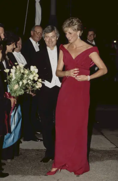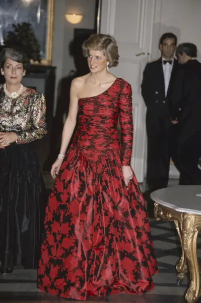 Kuninkaallisen Ranskan kiertueensa aikana Diana osallistui illalliselle Ison-Britannian Pariisin-suurlähetystössä yllään Catherine Walkerin punamusta kukkapuku, joka sisälsi yhden olkapään siluetin ja dramaattisen täyteläisen hameen.
