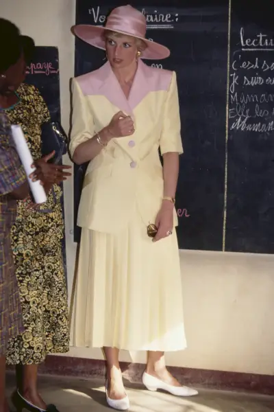 Vieraillessaan kuurojen oppilaiden kanssa Kamerunin koulussa, prinsessa Diana käytti Catherine Walkerin leinikkikeltaista hamepukua, joka oli koristeltu vaaleanpunaisella kauluksella ja napeilla ja varustautuneena Philip Somervillen vaaleanpunaisella hatulla.