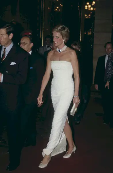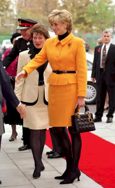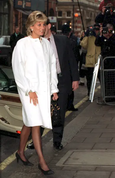 Lounastilaisuuteen Brown's-hotellissa Lontoossa prinsessa Diana saapui Versacen valkoiseen takkiin, jonka hän yhdisti helmikoruihin ja Lady Dior -laukkuun.