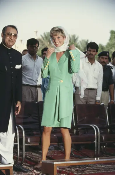 Kirkkaan vihreä Catherine Walker -mekko, jota prinsessa Diana käytti Pakistanissa, sisälsi koordinoivan huivin hänen vierailulleen Badshahin moskeijassa.