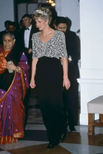 Prinsessa Diana käytti toista Catherine Walker -pukua osallistuakseen juhliin Intiassa. Suunnitteluun sisältyi kimalteleva kirjailtu liivi, jonka Diana soitti Spencerin perheen tiaaralla sekä timantti- ja helmikorvakoruilla.