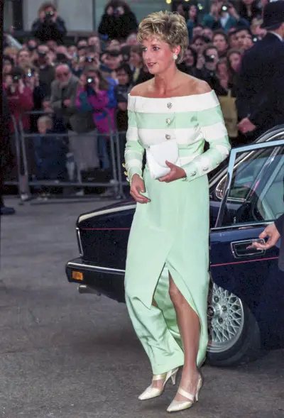 Prinssi Charlesista eroamisen jälkeisinä kuukausina Diana osallistui elokuvan ensi-iltaan Satunnainen sankari Catherine Walkerin mintunvihreässä mekossa. Hartioiden ulkopuolella oleva siluetti sisälsi valkoisia raitoja ja nappiyksityiskohtia liiviosassa, ja Diana lisäsi satiinipumput, valkoisen kytkimen ja timanttikorvakorut viimeistelemään lookin.