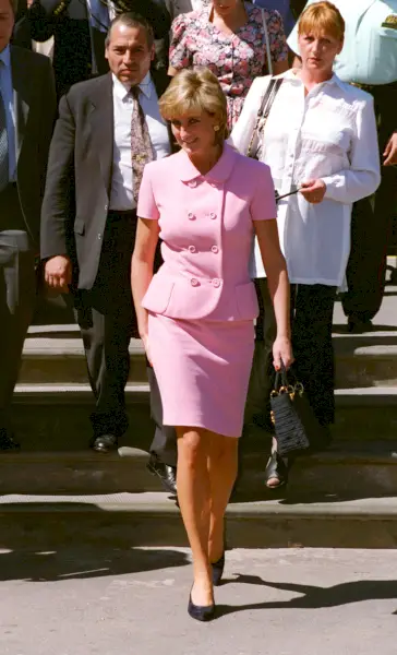 Eron jälkeinen Dianan sartoriaalimuutos näki hänet lyhyemmissä helmassa ja ylellisissä suunnittelijoissa. Tämä vaaleanpunainen Versace-hamepuku oli varhainen esimerkki, jota Diana käytti neliön muotoisen Dior Chouchou -laukun kanssa, joka pian nimettiin Lady Dioriksi.