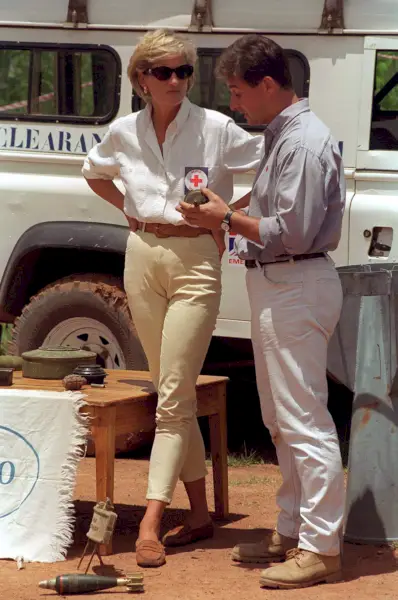 Prinsessa Diana keskittyi suurelta osin lapsiinsa ja hyväntekeväisyystyöhönsä avioeron prinssi Charlesista jälkeen, ja vuonna 1997 hänet esiteltiin HALO-säätiölle hänen vieraillessaan Angolassa Britannian Punaisen Ristin kanssa. Maamiinojen raivaamiseen keskittynyt humanitaarinen järjestö ansaitsi välittömästi Dianan tuen. Kuvassa tässä rennossa valkoisessa napituspaidassa, khakihousuissa ja vastaavissa housuissa, prinsessa Dianan tapaamisen maamiinoista selviytyneiden kanssa ja hänen kävelemisestä raivatun kaistan läpi yhdellä Angolan aktiivisesta miinakentästä kerrottiin olleen osansa. Yhdistyneiden kansakuntien miinankieltosopimus joka allekirjoitettiin pian hänen kuolemansa jälkeen.
