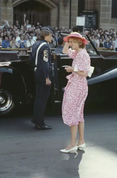 Diana käytti tätä kukkakuvioista vaaleanpunaista mekkoa ja siihen sopivaa hattua ensimmäisen ulkomaankihlauksensa aikana – kuuden viikon kiertueella Australiassa ja Uudessa-Seelannissa.