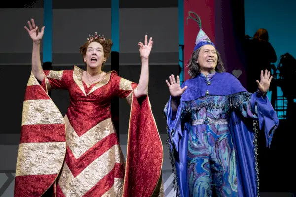 Kuten hän teki kanssa Metsään , De Bessonet ylläpitää hurmaavaa tasapainoa vakavuuden ja ironisen mauttomuuden välillä tässä yksinkertaisessa mutta silti houkuttelevassa lavastusuksessa (David Zinnin taloudelliset ja värikkäät lavasteet ja Andrea Hoodin pilkatut keskiaikaiset mekot). Hänen yhtyeensä (hyvin öljytty kone vain kymmenen päivän harjoitusten jälkeen) on rikkauksien häpeä: Danielsin ja Jacksonin äänet sulautuvat mehukkaasti heidän romanttisiin duetoihinsa; kiukkuisena miespoikana ja katkerana lohikäärmenaisena, Urie ja Harris muki loistokkaalla ilolla; J. Harrison Gheen kertova Jester glitter-huulipunassa ja fuscia-asussa luo genderfluid-tunnelmaa; ja ystävällisenä, mykkänä kuninkaana David Patrick Kelly ilmaisee paljon tehokkaalla, kompaktilla kehyksellään.