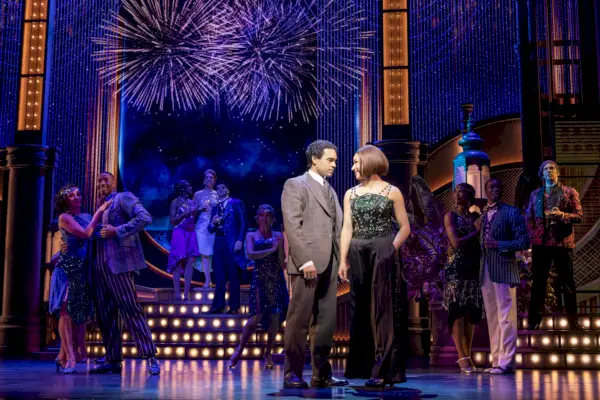 Älä ymmärrä minua väärin: Suuri Gatsby ei ole älykäs, tyylikäs musikaali, joka ei voi kilpailla tahmeampien kanssa. Se ei yksinkertaisesti ole tarpeeksi tahmeaa. Säveltäjä Jason Howlandin ja sanoittaja Nathan Tysenin jazz-pohjainen partituuri ( Paratiisin aukio ) seikkailee funkin, Disneyn prinsessaballadin ja britpopin ripauksen parissa. Musiikkipaletin eklektisyydestä huolimatta mikään kappaleista ei jää korviin huolimatta Jeremy Jordanin rasittavasta vokalisoinnista ( Uutiset ) ja Eva Noblezada ( Hadestown ). Nämä viehättävät Broadwayn eläinlääkärit esittävät nouveau-rikasta mysteerimiestä Jay Gatsbyä ja Daisy Buchanania, hänen rakastamaansa tyttöä, joka meni kiihkeästi naimisiin vanhan rahan kotiväkivallan käyttäjän Tomin kanssa (John Zdrojeski, joka näyttelee kaikkia lavalla). Tarinan – tiedät lukemalla kirjan tai nähdessäsi muita versioita – kertoo Nick Carraway (Noah J. Ricketts), Daisyn serkku ja Gatsbyn naapuri. Kuten Gatsby, ensimmäisen maailmansodan veteraani, Nickillä on eturivin istuin Jazz-ajan New Yorkissa, joka on täynnä saappaiden viinaa, kyynisyyttä ja uskottomuutta.