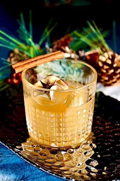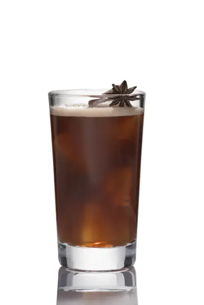 Lisää kaikki ainekset ravistimeen; ravista jäillä. Siivilöi kaksinkertaisesti kivilasiin yhdellä suurella jääpalalla; koristele tähtianiksella.