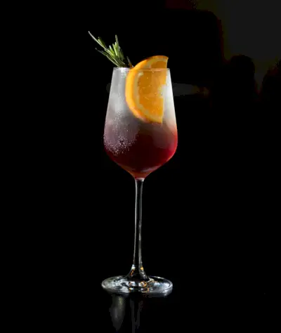 Lisää kaikki siirappi, likööri, appelsiinikatkerat ja soodavesi suihkeeseen taiviiniälasi. Lisää jää jakimalteleva viiniä. Koristele rosmariininoksalla ja appelsiiniviipaleella.