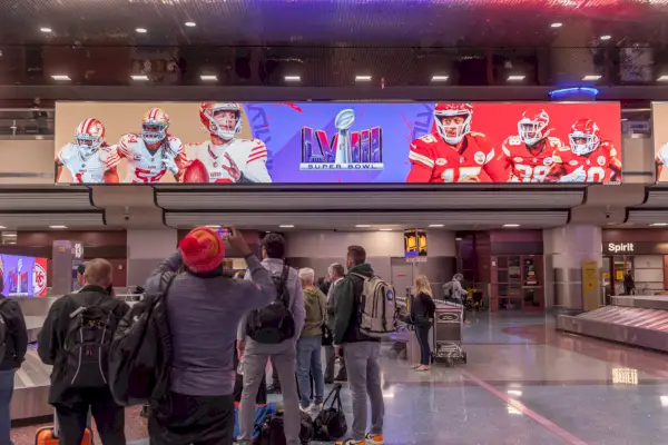 Super Bowl -kuume iskee heti Harry Reidin lentokentälle saavuttuasi: Las Vegasin isäntäkomitean vapaaehtoiset odottavat velvollisuudentuntoisesti Arrivalsissa saapuvalle väkijoukolle: merkkiset aurinkolasit, minijalkapallot ja jopa neula, jossa yhdistyvät Super Bowlin logot ja Vegas.
