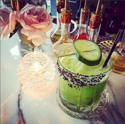 Ja heillä on hauskaa, sillä nämä juomat näyttävät joltakin vanhan Hollywoodin elokuvalta. Instagrammillisin vaihtoehto valikossa on When We Were Young. Valmistettu vodkasta, vaniljatanosta, perhoshernekukasta ja kuohuviinistä, se saa kauniin violetin sävyn. Jos etsit terveellisempää juomaa, Too Good For You on herkullinen ja valmistettu lehtikaalista, tequilasta, limetistä ja agavesta. Last Night- ja Sleeping With Strangers -tekstit ovat myös mahtavia, ja katsotaanpa suoraan, todella hauskaa sanoa.