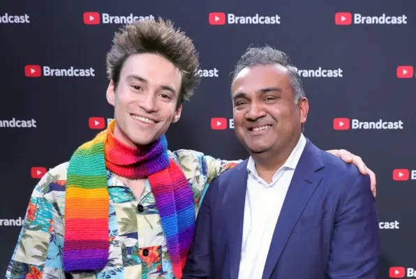 YouTuben toimitusjohtaja Neal Mohan (oikealla) ja laulaja Jacod Collier osallistuvat YouTube Brandcast 2023 -tapahtumaan David Geffen Hallissa 17. toukokuuta 2023 New Yorkissa.Kevin Mazur / Getty Images YouTubelle